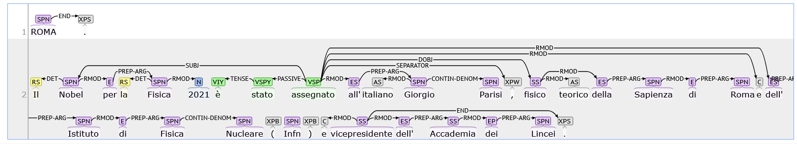 Primo esempio, il POS Tagging, cioè l'etichettatura (Tag) delle Parti del Discorso - Part Of Speech (POS) e l'analisi morfologica (Morphological Analysis). Per esempio di "i", il software dice che è un articolo, plurale, maschile e che la base è "il". Di "andò" dice che è un verbo, tempo passato remoto, terza persona singolare e che la base è "andare". Qui la visualizzazione dell'output di TextPro, un NLP della Fondazione Bruno Kessler di Trento: